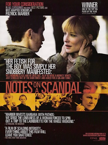 О фильме: Преподавательница гуманитарных наук Шеба Харт заводит роман со своим пятнадцатилетним учеником, что разрушительно сказывается на ее личной и профессиональной жизни. Одинокая пожилая учительница Барбара Коветт, похоронив единственное близкое существо – кота Порти, пытается найти ему замену в лице новоприбывшей молодой коллеги Шебы и шантажирует свою жертву, узнав о ее преступной любовной связи с 15-летним учеником Стивеном. Это дуэль двух сильных личностей – доверительная дружба, переходящая в акт безумной истерической мести.